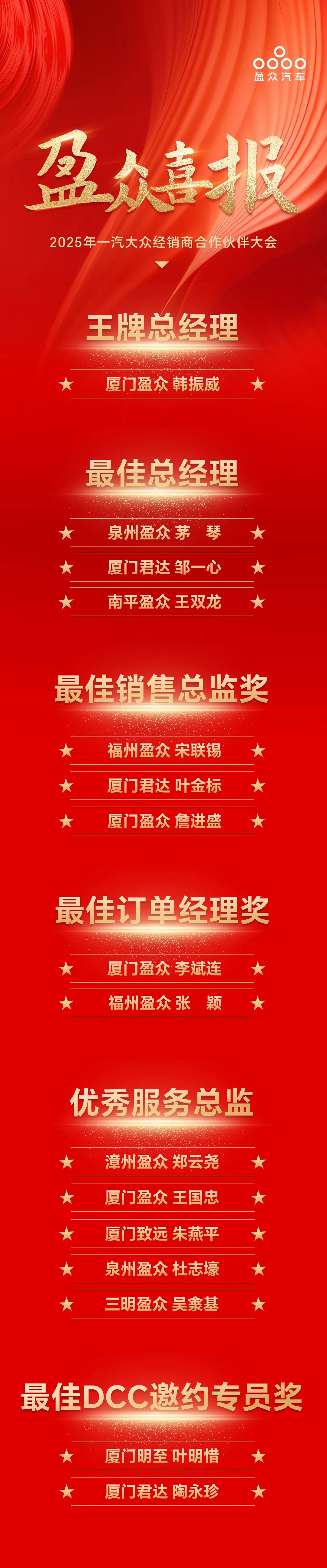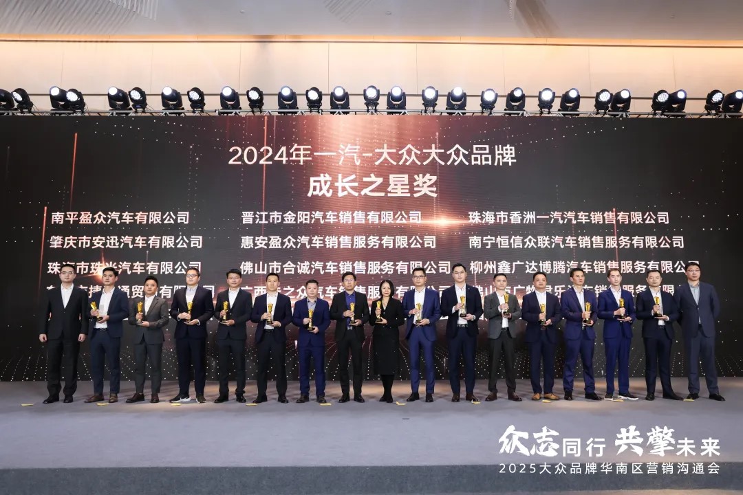 近日,2025大眾品牌經(jīng)銷商合作伙伴大會(huì)、一汽-大眾華南區(qū)經(jīng)銷商年會(huì)相繼召開,2024年度一汽-大眾優(yōu)秀經(jīng)銷商名單及個(gè)人獲獎(jiǎng)名單新鮮出爐。盈眾一汽-大眾團(tuán)隊(duì)憑借過硬的綜合實(shí)力及銷售業(yè)績、運(yùn)營管理、客戶服務(wù)體驗(yàn)等多維度的亮眼表現(xiàn),榮獲“功勛經(jīng)銷商集團(tuán)”“卓越五星經(jīng)銷商”“五星經(jīng)銷商”“王牌總經(jīng)理”等系列獎(jiǎng)項(xiàng)。
