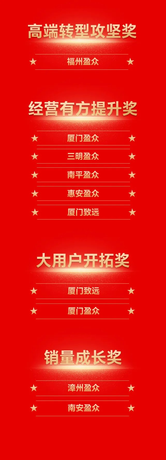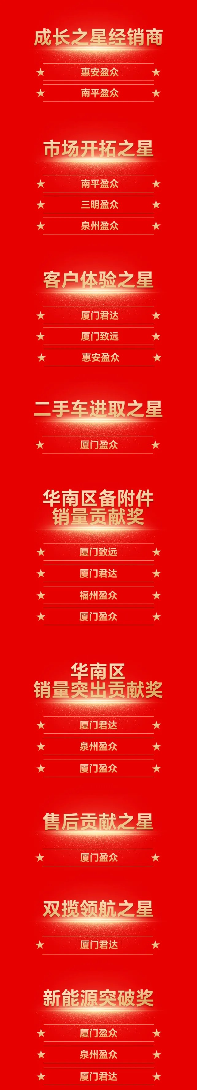作為一汽-大眾標(biāo)桿經(jīng)銷商,廈門盈眾已連續(xù)16年獲得“五星經(jīng)銷商”榮譽(yù)稱號(hào),今年,廈門盈眾更是成為華南區(qū)首家獲得“卓越5星經(jīng)銷商”的4S店。泉州盈眾、廈門君達(dá)、福州盈眾2024年持續(xù)發(fā)力、多點(diǎn)突破,入選“五星經(jīng)銷商”。廈門致遠(yuǎn)秉持初心,腳踏實(shí)地,獲得“四星經(jīng)銷商”,漳州盈眾、三明盈眾也憑借不懈努力,入選“三星經(jīng)銷商”,惠安盈眾、南平盈眾獲得“成長之星經(jīng)銷商”。