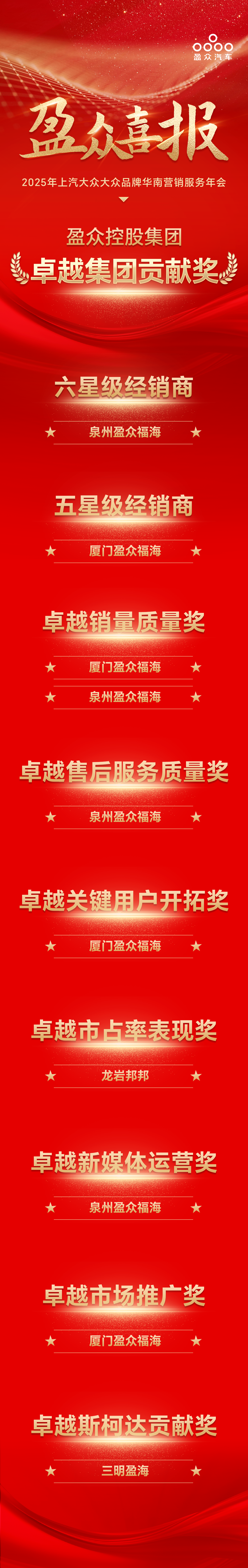 喜報(bào) | 盈眾集團(tuán)榮獲上汽大眾品牌“卓越集團(tuán)貢獻(xiàn)獎(jiǎng)”“六星級(jí)經(jīng)銷商”等榮譽(yù)